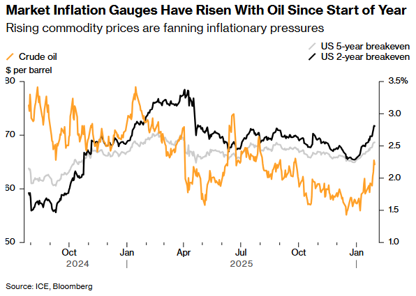 越来越多的迹象表明,他们的担忧不无道理:1月份,普通国债与通胀保值国债(TIPS)的收益率差急剧扩大,升至数月来的最高水平。另一衡量市场预期的指标——通胀互换利率也已攀升。